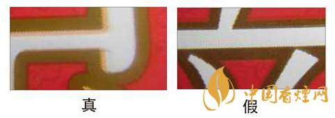 看條盒商標(biāo)印刷。真煙套印準(zhǔn)確,凹印效果好,邊緣圖紋圓潤(rùn)。假煙沒(méi)有凹凸效果,且邊緣圖紋粗糙。