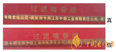 看小盒拉帶。真品“南京”(紅)拉帶上字體清晰,光澤鮮艷,字體里有許多細(xì)小的水平紋路。假煙筆畫(huà)較粗,光澤暗淡。