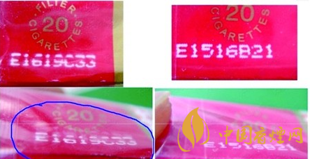 5、激光打碼:真煙采用雙層激光打碼,把外膜揉起,能看到打碼的痕跡。假煙一般都是直接印刷在包裝上,沒(méi)有打碼痕跡。這種方法同樣也適用于條盒包裝。